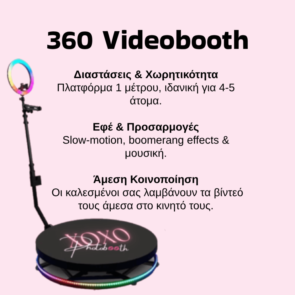 Μια μοναδική εμπειρία βίντεο όπου οι καλεσμένοι στέκονται σε μια πλατφόρμα, ενώ η κάμερα περιστρέφεται γύρω τους, δημιουργώντας εντυπωσιακά clips από κάθε γωνία.